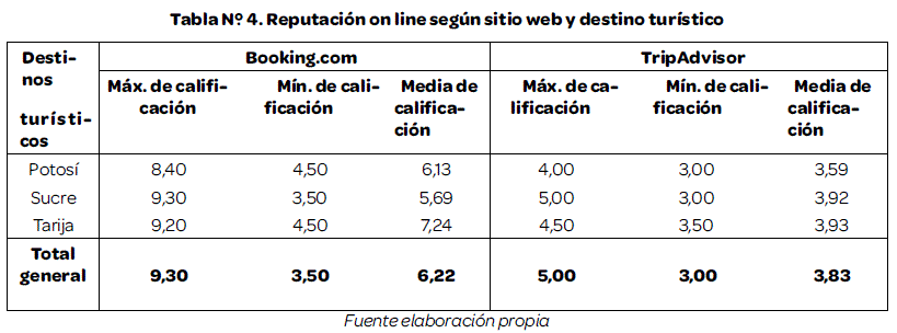Since the appearance of Web 2.0, the relationship and communication between clients and companies has taken a new turn in social media marketing, in the case of the hotel sector the valuation of these services is increasingly influenced by the comments Consumers oniine. Considering places like Trip Advisorand Booking. com, this article analyzes the scores of clients of 59 hotels located in the cities of Sucre, Potosí and Tarija in order to achieve the objectives of comparing the scores; To show the relationship between the categorization of hotels and the average global score and to establish a relationship between the average global score and the use of social networks such as Facebook, Twiter and the hotels' websites.