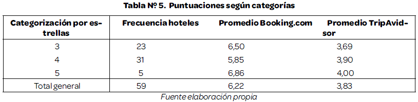 An important conclusion of this work is that the ratings in the majority of the cases are favorable especially for the hotels of 3 and 4 stars; It has been shown that there is no significant relationship between the category of hotels and the scores on the two websites analyzed; The use of social networks has a significant relationship with the scores, finally the study found significant variations in the scores of both sites analyzed.