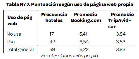 En el caso de Booking.com la puntuación más alta corresponde a los hoteles que usan su página web, por lo que se puede afirmar que existe una relación significativa, mientras que en TripAdvisor existe una diferencia mínima entre los hoteles que usa página web y la puntuación en este sitio.