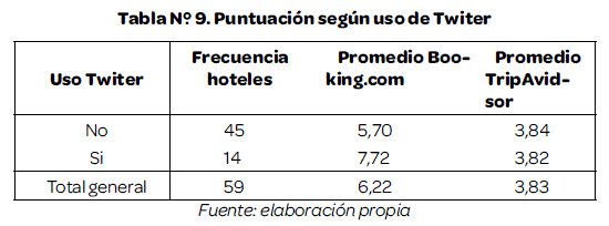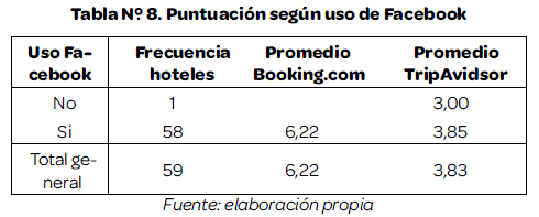 En el caso de las redes sociales como Facebook y Twiter la tendencia es directa en el caso de Booking.com mientras que en el caso de TripAdvisor, los hoteles que no usan redes sociales tiene una calificación promedio mayor en relación a los que usan.