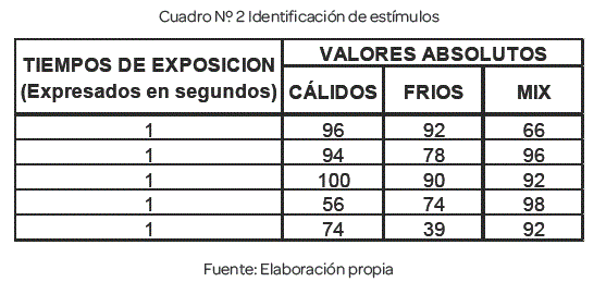 Los tiempos de exposición utilizados y la identificación de estímulos obtenidos para cada subgrupo en cada uno de los tiempos de exposición fueron los indicados en el cuadro número 2.