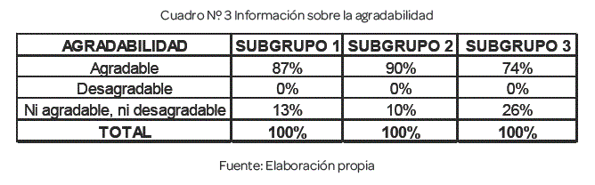 Dentro del cuestionario de tipo taquistocópico, se incluyó una pregunta acerca de la agradabilidad de los estímulos presentados en cada subgrupo, obteniéndose los siguientes resultados, presentados en el cuadro número tres.