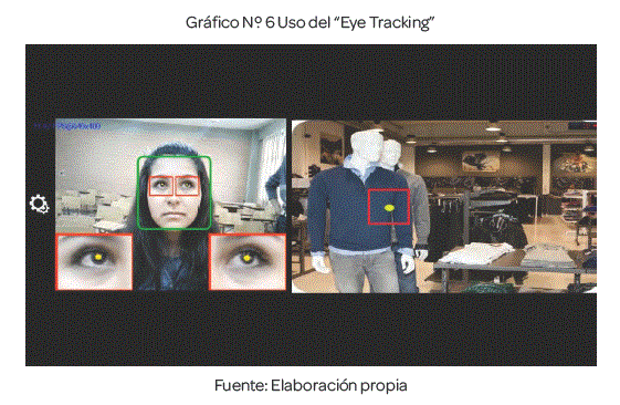 Dentro del experimento realizado, se hizo uso de un instrumento propio del neuromarketing, que es el "eye tracking"; mediante una aplicación celular diseñada para este propósito, encontrada después de una exhaustiva búsqueda en línea. Para su uso, se pidió a los sujetos de prueba posicionarse frente a dicho instrumento de medición, el cual sirvió para indicar las trayectorias que siguen las pupilas y los lugares en los que más se posan estas, ante los estímulos visuales presentados; es un tipo de medición no invasiva, por lo cual los sujetos podían actuar y desenvolverse con total naturalidad, sin afectar la recolección correcta de la información. Un ejemplo del uso de éste instrumento se presenta en el gráfico número seis.