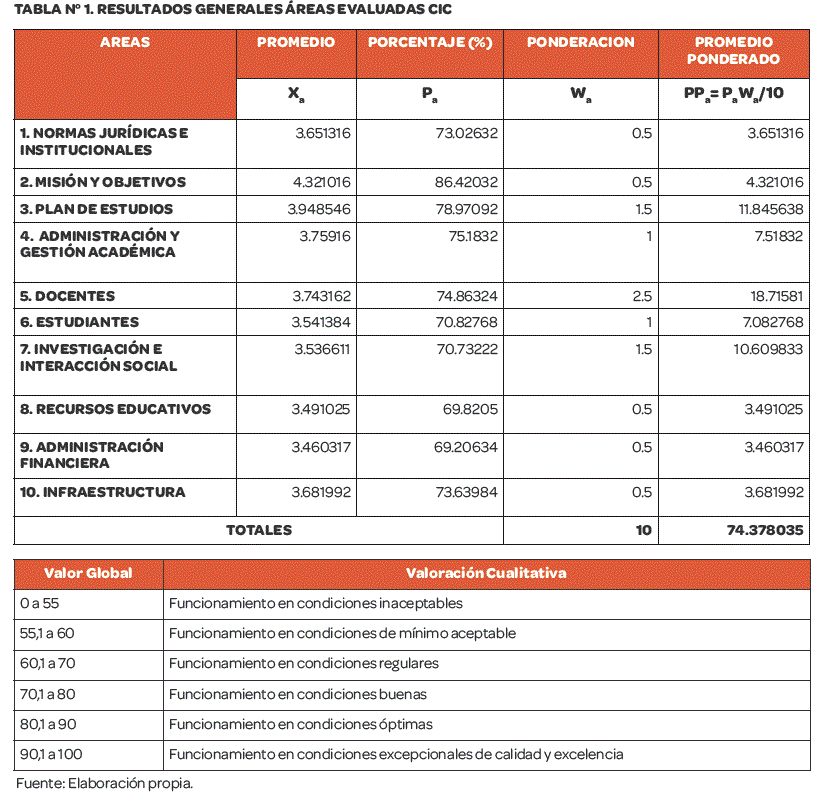 Seguidamente se presentan los resultados generales obtenidos con la aplicación de los cuestionarios antes indicados, a los diferentes estamentos que forman parte de la CIC, los mismos muestran que dicha Unidad Académica ha obtenido una calificación de 74.37, lo que implica que su funcionamiento se encuentra en condiciones buenas.