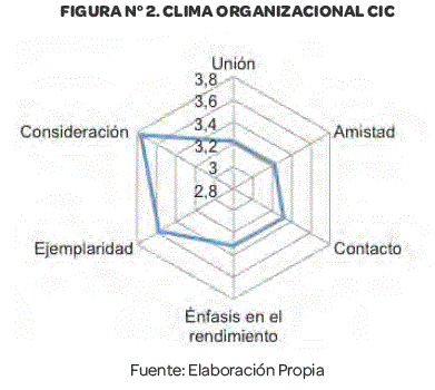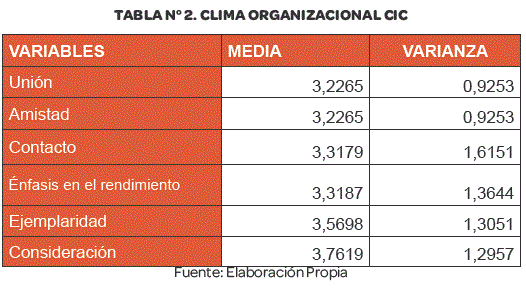 A través del Organizational Climate Descriptive Questionarie (OCDQ), se analizó los diferentes componentes de clima organizacional que caracteriza al trabajo de los docentes de la CIC, para ello, se determinaron las medias aritméticas de las variables: unión, amistad, contacto, énfasis en el rendimiento, ejemplaridad y consideración.