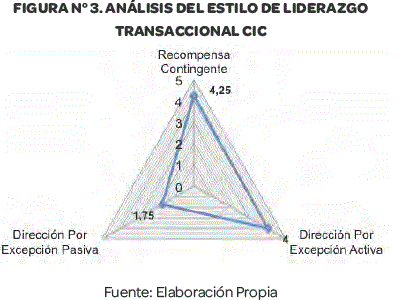 El tipo de liderazgo medido a través del Multifactor Leadership Questionnaire (MLQ), indica que el estilo de liderazgo predominante en la CIC es transaccional, debido a que el promedio de respuestas del director de carrera (3,83) ha estado comprendido en el rango correspondiente a 3 y 4, que corresponde con esta característica en el estilo de dirección, marcado por el establecimiento de objetivos, seguimiento y control; donde los miembros de la organización deben cumplir con sus actividades y realizar algunas adicionales, para obtener una recompensa, que por lo general se traduce además del salario en la emisión de certificaciones para la obtención de puntaje en el escalafón docente.