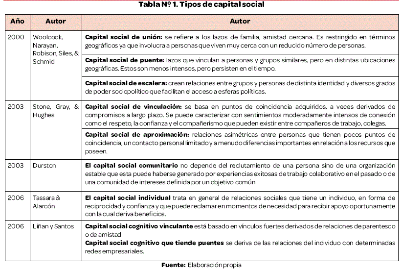 Según Woolcock & Narayan (2000) y Robison, Siles, & Schmid (2003) señalan que existen tres clasificaciones sobre los tipos de capital social y que cada una de estas se vincula a una definición del capital social refiriéndose al tipo de lazo y a las personas que agrupa.