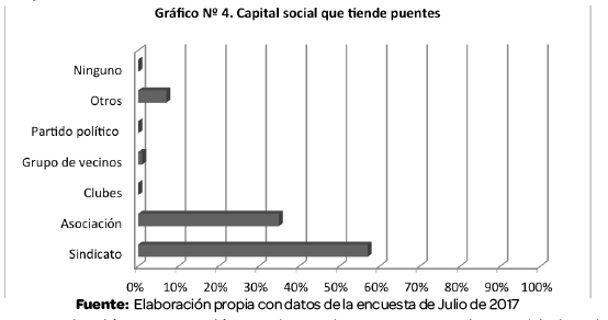 Se evidencia que el capital social predominante con un 60% es el de unión, seguido del capital de puente y en menor grado el de escalera.