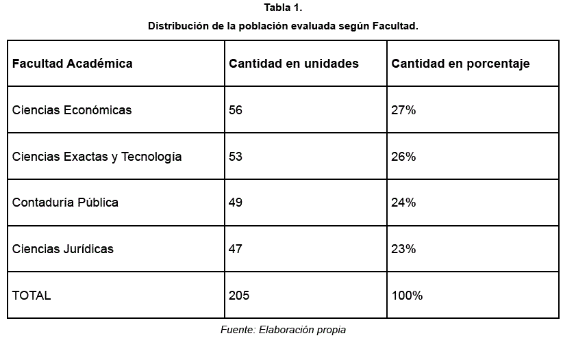 Las 205 evaluaciones equivale al 100% de la muestra y presentó la siguiente distribución: 27% correspondió a la Facultad de Ciencias Económicas, 26% a la Facultad de Ciencias Exactas y Tecnología, 24% a la Facultad de Contaduría Pública y 23% a la Facultad de Ciencias Jurídicas.