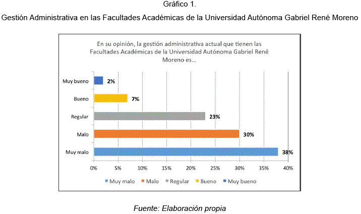 In this article, we studied the administrative management currently applied to the four largest academic faculties of the Gabriel René Moreno Autonomous University, which is part of the public university system of Bolivia, this had as an objective to analyze the processes and procedures in these faculties , with the purpose of identifying their present insufficiencies, these also include, to the administrative personnel as far as procedures are concerned, which allowed to know their degree or level of perception.