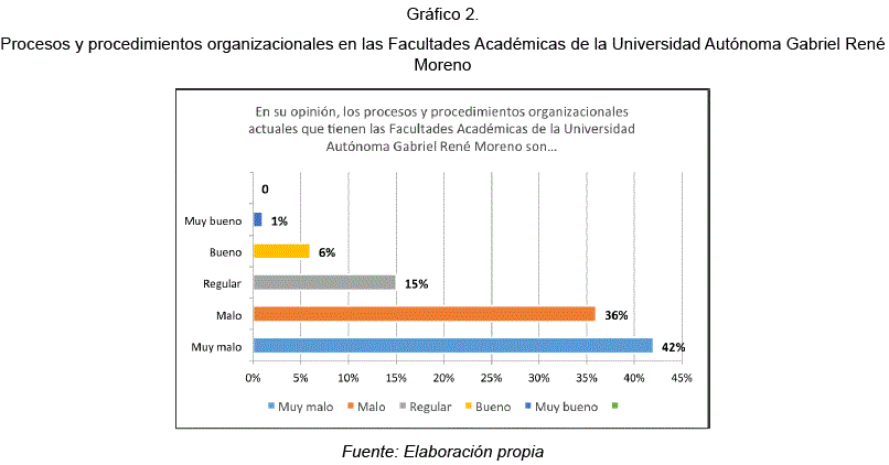 Al igual que la anterior figura, se observó que existe una cantidad notablemente mayor (42%), la cual opina que los procesos y procedimientos organizacionales actuales de las facultades académicas de la Universidad Autónoma Gabriel René Moreno son muy malos.