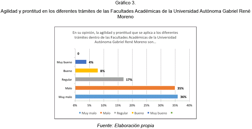 De la misma manera que la figura anterior, se observó que existe una cantidad notablemente mayor (36%), la cual opina que la agilidad y prontitud que se aplica a los diferentes trámites dentro de las facultades académicas de la Universidad Autónoma Gabriel René Moreno es muy mala.