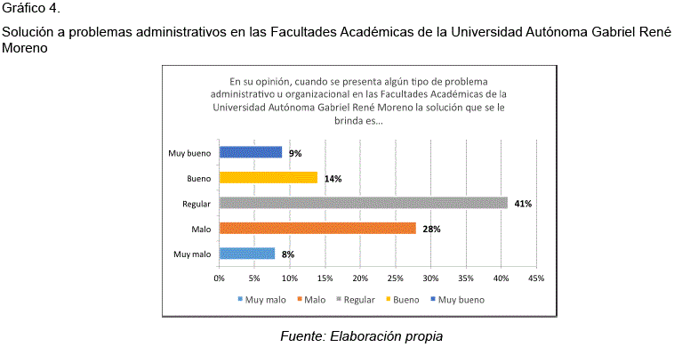 También se puede evidenciar que existe una cantidad notable, la cual opina que los esfuerzos que se hacen para mejorar los procesos y procedimientos administrativos y organizacionales en los trámites que se llevan a cabo dentro de las facultades académicas de la Universidad Autónoma Gabriel René Moreno son insuficientes y que cuando se presenta algún tipo de problema administrativo u organizacional la solución que se le brinda es regular.