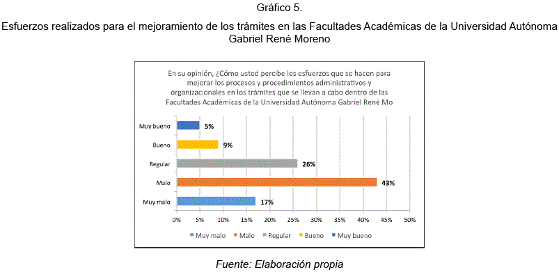 Mediante esta figura se observó que existe una cantidad notablemente mayor (43%), la cual opina que los esfuerzos que se hacen para mejorar los procesos y procedimientos administrativos y organizacionales en los trámites que se llevan a cabo dentro de las facultades académicas de la Universidad Autónoma Gabriel René Moreno son malos.