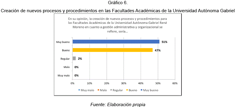Mediante esta figura se observó que existe una cantidad notablemente mayor (51%), la cual opina que la creación de nuevos procesos y procedimientos para las facultades académicas de la Universidad Autónoma Gabriel René Moreno en cuanto a gestión administrativa y organizacional se refiere sería muy buena.