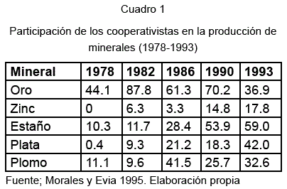 Como se puede ver en el siguiente Cuadro, entre 1986 y 1993 existe un aumento de la participación de las Cooperativas en el conjunto de la producción minera, siendo el caso más notable el estaño y la plata que, para 1993, es de 59 y 42% respectivamente.