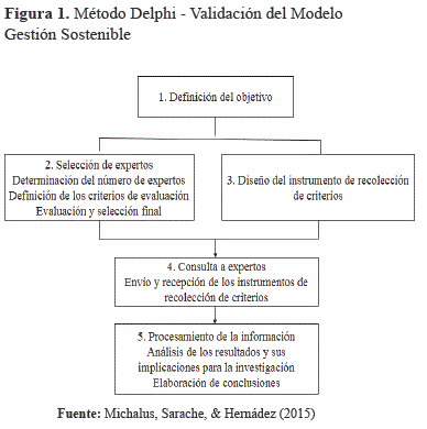 Con el objetivo de validar el Modelo de gestión sostenible propuesto, se emplea el método Juicio de Expertos. Dentro de esta denominación se manifiesta que un experto debe poseer un conocimiento amplio y profundo de la tarea o actividad que será objeto de análisis y valoración y tiene que estar familiarizado con el sistema en el que se desarrolla. Para la determinación del criterio de expertos se toma como base o guía los procedimientos realizados por Aparicio (2013); Michalus, Sarache, & Hernádez (2015) y Reguant-Álvarez & Torrado-Fonseca (2016) adaptado a las condiciones de esta investigación. Un esquema del mismo se muestra en la Figura 1 y a continuación se describen el desarrollo de cada uno de sus pasos.