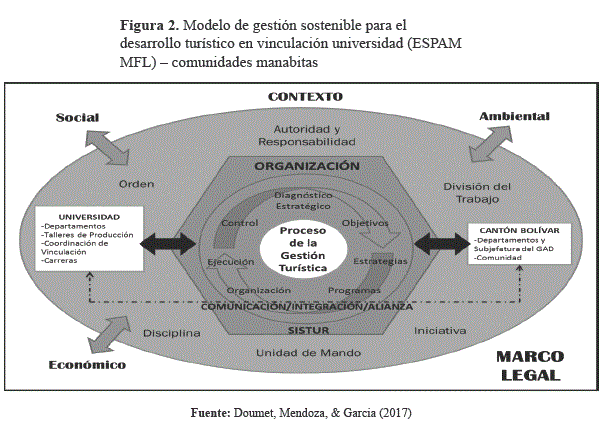 El modelo propuesto por Doumet, Mendoza, & García (2017) para la gestión turística incluye elementos fundamentales de una planificación estratégica (diagnóstico estratégico, objetivos, estrategias, programas, organización, ejecución y control), de tal forma que la ESPAM MFL pueda incidir de manera directa y sistemática con los procesos de los GAD cantonales de la provincia de Manabí, tomando como punto de referencia la necesidad de mejorar la gestión vinculada de todos los actores turísticos.