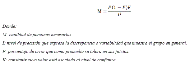 Esta selección se hace a partir del cálculo del número de integrantes necesarios a entrevistar, teniendo en cuenta el nivel de confianza, la proporción de error y el nivel de precisión deseado a través de la expresión siguiente: