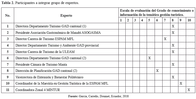 Con el objetivo de trabajar en el proceso de validación del Modelo de gestión sostenible para el desarrollo turístico en vinculación universidad (ESPAM MFL) -comunidades manabitas, se hace necesario seleccionar un conjunto de expertos, los cuales pueden estar contemplados por estudios teóricos de esta actividad, especialistas de la práctica de la gestión turística y directivos o funcionarios de Departamentos de Turismo del territorio, de manera que en los análisis se incluyan sus criterios desde diferentes puntos de vista y que al mismo tiempo se complementen.
