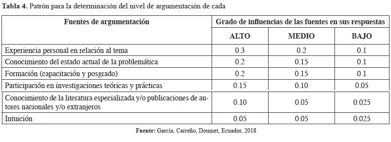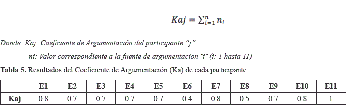 Con estos valores (tabla patrón) es calculado el Coeficiente de Argumentación (Ka) de cada participante utilizando la siguiente ecuación. En la tabla 5 se detalla el valor de este coeficiente para cada uno de los participantes.