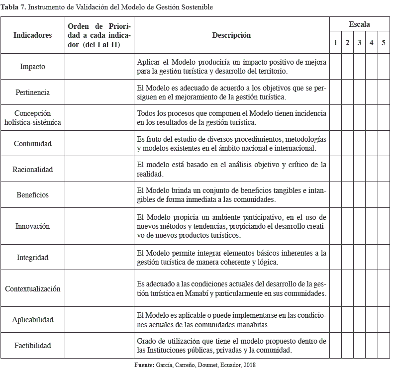 The objective of this research is to present the results of the validation of the sustainable management model linked from the Escuela Superior Politécnica Agropecuaria de Manabí "Manuel Félix López" for the tourism development of the communities of Manabí province in Ecuador. The research presents an analysis of the model proposed by Doumet, Mendoza, & Garcia (2017) and integrates other processes proposed by Garcia (2017). To verify the applicability of the model and valídate it, the Delphi method was used, using the procedures performed by Aparicio (2013); Michalus, Sarache, & Hernádez (2015) and Reguant-Álvarez & Torrado-Fonseca (2016) adapting it to the conditions of this research, to select the experts, the Competency Coefficient was evaluated according to the Knowledge or Information Coefficient and the Coefficient of Argumentation for each expert. Eleven indicators were established in the validation instrument of the model and the results showed that the vast majority of the responses in the evaluations are located within the classification: strongly agree or agree and that the indicators of contextualization, applicability, feasibility and integrity of the proposed sustainable management model. The Kendall W-coefficient test was also applied to determine the degree of association between the criteria issued by the experts. The valúes obtained condition the rejection of the nuil hypothesis, so the judgment of the experts is consistent and they agree on the weighting of the calculated indicators, verifying that the consistency between their opinions is strong in relation to the proposed Sustainable Management Model.