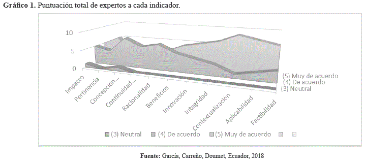El resultado de la aplicación del instrumento de evaluación (ver gráfico 1) señala que la inmensa mayoría de las respuestas en las evaluaciones por los expertos se ubican dentro de la clasificación: muy de acuerdo o de acuerdo y que sobresalen los indicadores de contextualización, aplicabilidad, factibilidad e integridad del modelo de gestión sostenible propuesto.