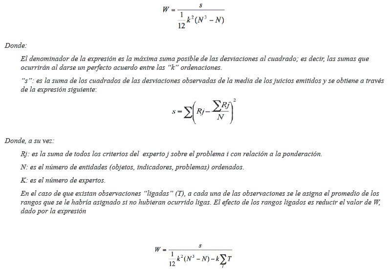 Dado que en la mayoría de los problemas de toma de decisiones no se especifican las características de los parámetros de la población de la cual se extrajo la muestra, se justifica el empleo de pruebas no paramétricas. El coeficiente de concordancia de Kendall (W) resulta útil en estudios de confiabilidad entre jueces (expertos). La expresión matemática para su cálculo es: