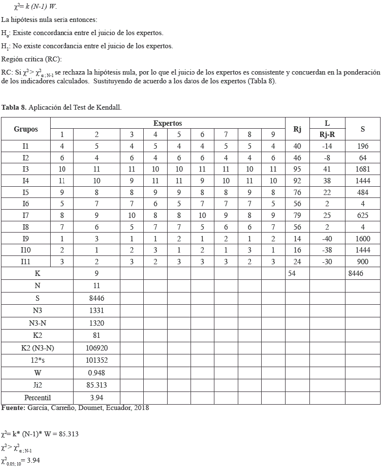 De la aplicación del Test de Kendall (ver tabla 8), se comprueba que no existe una coincidencia casual entre los expertos, por lo cual se llega a la conclusión que la consistencia entre sus opiniones es fuerte, con relación al Modelo de gestión sostenible propuesto. Por esta razón, a partir de la aplicación del instrumento de validación utilizado se confirma que el Modelo, muestra como principales características las siguientes: