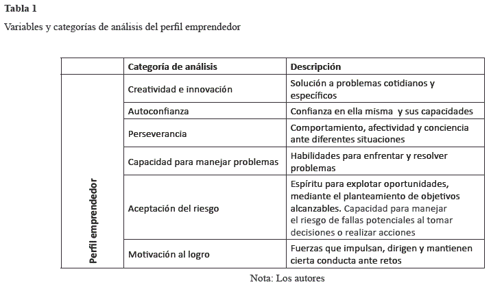 La variable de la investigación es el perfil emprendedor de las madres solteras. En este sentido, el perfil lo entendemos como un constructo o variable multidimensional que trata sobre las características y actitudes de la mujer emprendedora. Esta variable se puede observar a través de las categorías que integran el constructo, que, al obtener información de cada una de ellas, mediante la aplicación del instrumento, se puede determinar el perfil emprendedor en la muestra del presente estudio. En la tabla 1 se conceptualiza cada una de las categorías de análisis que integran la variable en estudio.