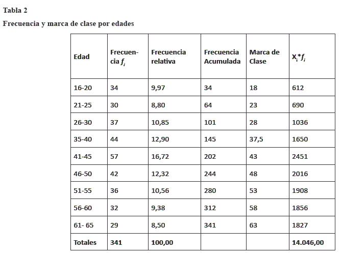 Nota: Los Autores. En la tabla se observa que hay un rango de edades entre 16 y 65 años, para 341 posibles edades diferentes en la muestra, además, el mayor intervalo de la muestra está representado en las edades de 41 a 45 años ya que tiene un 16,72%