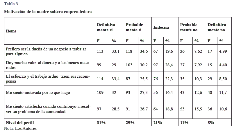 Una de las característica del perfil emprendedor es la motivación que tiene la mujer para desarrollar su propio negocio, ya que esto forma parte de la indentidad del emprendedor. En la tabla 3 se muestran los resultados de la categoría motivacional de la madres solteras emprendadoras del noreste de la ciudad de Guayaquil