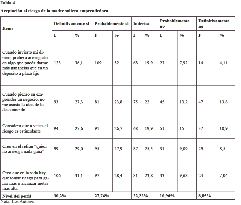 La siguiente categoría se refiere a la capacidad de la madre soltera emprendedora para manejar el riesgo de fallas potenciales al tomar decisiones o realizar acciones. Tal como se puede observar en la tabla 4. El riesgo es un aspecto característico en los emprendedores. En este caso, nos referimos a las mujeres que se arriesgan a comenzar una actividad empresarial, para lo cual es importante analizar la percepción que tiene la mujer jefa de hogar emprendedora a la hora de enfrentase con la posibilidad de obtener un resultado diferente al previsto o al riesgo.