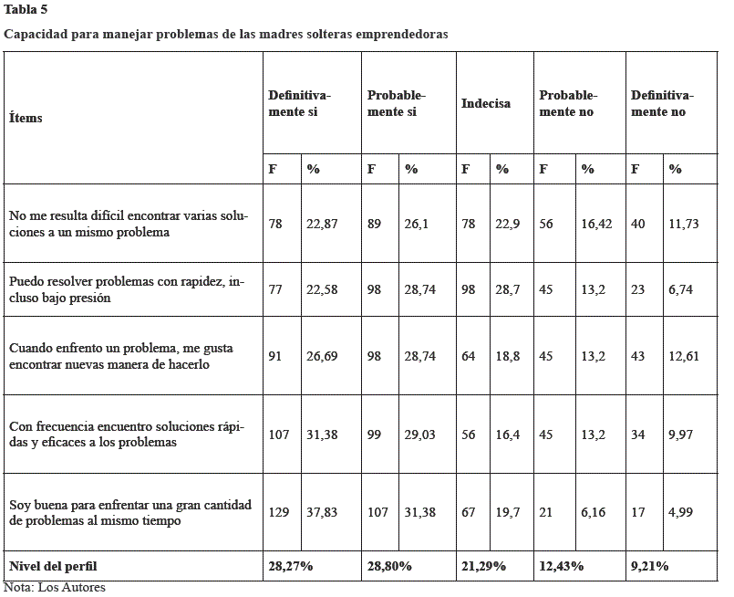 Los resultados indican que el 57,07% de las madres solteras emprendedoras tiene un nivel del perfil alto. Este grupo de mujeres identifica claramente las discrepancias entre una situación actual y una deseada y actúa para resolver tal discrepancia. En tal sentido, el 69,21% se consideran buenas para enfrentar una gran cantidad de problemas al mismo tiempo. Este nivel del perfil identifica que la mujer emprendedora está orientada a superar los obstáculos y dificultades que le impidan lograr un objetivo.