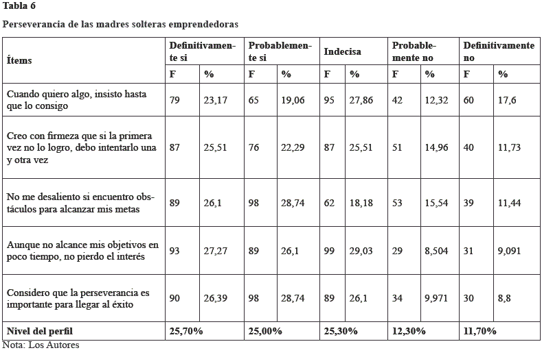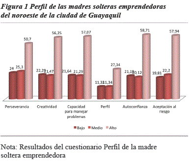 La mujer jefa de familia emprendedora se caracteriza con un nivel alto en un 50,7% en la dimensión perseverancia en cuyo caso, tiene seguridad en la toma de decisiones ante cualquier situación frente al 24% que se sitúa en el perfil bajo. Con estos resultados se puede afirmar que existe coherencia entre las distintas categorías planteadas para determinar el perfil emprendedor de las madres solteras emprendedoras del noroeste de la ciudad de Guayaquil. La motivación, la autoconfianza, la aceptación al riesgo, la capacidad para manejar problemas, la creatividad y la perseverancia hacen parte de las características reconocidas de estas mujeres.