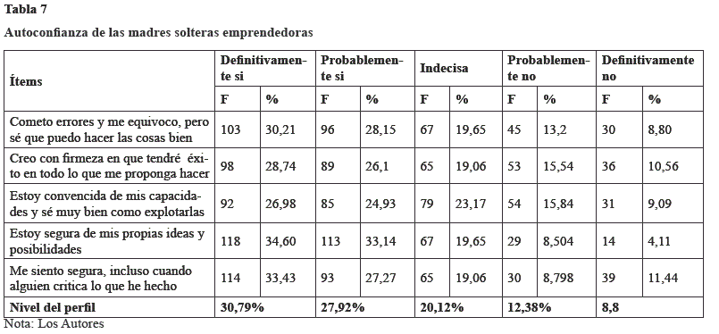Esta característica se refiere a la confianza que tiene la madre soltera emprendedora en ella misma y a su actividad, muestra firmeza en su decisión y es consciente de sus virtudes y capacidades. En la tabla 7 se muestran los resultados más relevantes de esta categoría.