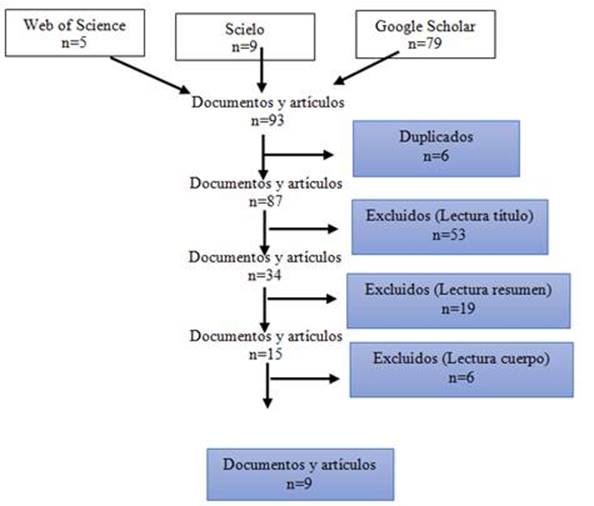 Para la selección y organización de las fuentes, se realizó la búsqueda entre los meses de diciembre 2020 y enero 2021; en el cual fueron ubicados 16,700 producciones científicas; posteriormente se llevó a cabo la indagación y el proceso de selección, donde fueron eliminadas las coincidencias, duplicados (idioma, publicaciones), por acceso a la información (acceso abierto); resultando un total de nueve artículos, siendo los criterios de la declaración utilizada, la técnica PRISMA para la elección de las fuentes académicas. El registro de los datos, atendió a las características de los artículos, siendo estos campos: país, año, resumen, palabras claves, metodologías, aportes principales.