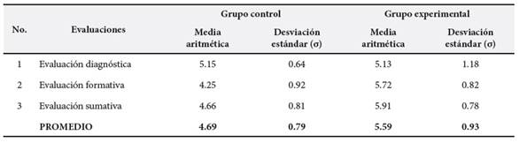En la Tabla 1, se inicia con la comparación de resultados obtenidos de la media aritmética de la evaluación diagnóstica aplicada a los grupos experimental y de control, se puede concluir que con las puntuaciones obtenidas, los dos grupos tienen el conocimiento necesario, para comenzar el estudio de la temática planteada, continuando con el segundo momento evaluativo (formativa) se puede observar que la diferencia entre los rendimientos de los grupos es de 1.47 puntos, diferencia que marca el grado de asimilación y rendimiento en la temática planteada, para finalizar en el último momento de evaluación (sumativa), el grupo experimental obtuvo mejores resultados en el rendimiento académico, con una diferencia moderada de 1.25 puntos. Para finalizar se realizó un promedio de los tres momentos evaluativos de estas 12 semanas, en el que se determinó que el grupo experimental obtuvo un porcentaje del 93.1% y el grupo control obtuvo un porcentaje del 78.1%, determinando que el grupo experimental desarrollo de mejor forma las competencias matemáticas, debido al uso y aplicación de las TIC en los procesos áulicos planificados.
