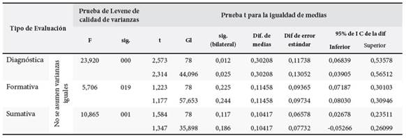 Tabla 2 Estudio prueba de Levene, cálculo de homogeneidad de varianzas evaluación diagnóstica, formativa y sumativa, y prueba t para igualdad de medias.