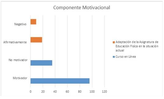 Con respecto al componente motivacional se tuvieron en cuenta la parte afectiva y emocional para los cursos en línea, el 96,4% (27) refiere que los cursos en línea fueron motivadores y solamente 1 (3.5%) indico que los cursos en línea no son motivadores legítimo. Del total de alumnos, 67.8% (19) opinaron afirmativamente la adaptación de la asignatura de Educación Física de modo correcto a la situación actual y el 32,14(9) manifestaron negativamente (Grafico 2).