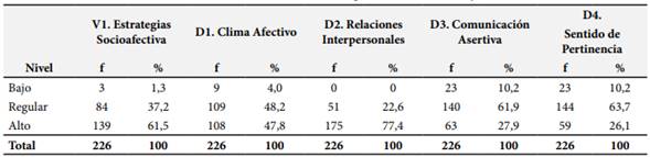Los resultados descriptivos demuestran que en la variable estrategias socioafectivas, el 61,5% de los estudiantes consideran que las estrategias socioafectivas se encuentran en un nivel alto; asimismo, el 37,2% refieren que estas estrategias se encuentran en un nivel medio; en cambio para el 1,3% se desarrolla en un nivel bajo. Por parte de las dimensiones, del total de los estudiantes se presenta que en referencia a la dimensión clima afectivo los estudiantes lo consideran en un nivel alto (47,8%) y en un nivel regular (48,2%). La dimensión relaciones interpersonales se desarrolla como un nivel alto (77,4%), nivel regular (22,6%) y nivel bajo (0%). La dimensión comunicación asertiva se desarrolla como un nivel alto (27,9%), nivel regular (61,9%) y nivel bajo (10.2%). En relación a la dimensión sentido de pertinencia se desarrolla como un nivel alto (26,1%), nivel regular (63,7%) y nivel bajo (10,2%), tal como se aprecia en la Tabla 3.