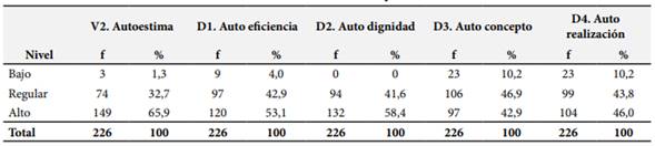 Seguido, en la variable autoestima el 65,9% de los estudiantes consideran que las autoestimas se encuentran en un nivel alto; asimismo, el 32,7% refieren que la autoestima se encuentra en un nivel medio, y el 1,3% se desarrolla en un nivel bajo. En relación a las dimensiones, del total de los estudiantes se revela que en cuanto a la dimensión autoeficiencia los estudiantes lo consideran en un nivel alto (53,1%), en un nivel regular (42,9%) y en un nivel bajo (4%). Sobre la dimensión autodignidad se desarrolla en un nivel alto (58,4%), nivel regular (41,6%) y nivel bajo (0%). Asimismo, la dimensión autoconcepto se desarrolla en un nivel alto (42,9%), nivel regular (46,9%) y nivel bajo (10,2%). En relación a la dimensión autorrealización se desarrolla en un nivel alto (46%), nivel regular (43,8%) y nivel bajo (10,2%), tal como se muestra en la Tabla 4.