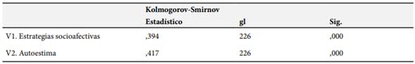 La Tabla 5, se desarrolló la prueba de normalidad el cual dio como resultado una significancia menor a 0,05; debido que la variable estrategias socioafectivas y autoestima tienen una sig. ,000; es decir los datos no tienen normalidad y no tienen formas paramétricas; entonces se utilizó la prueba de Spearman.