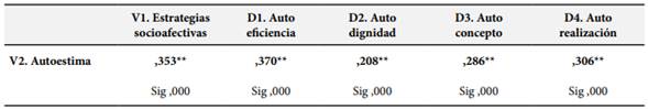 En cuanto a los resultados inferenciales, se dio a conocer como prueba de hipótesis la existencia de la relación entre las variables estrategias socioafectivas y la autoestima. Aplicando la prueba de Spearman se determinó que ambas variables tienen Rho de 0,353**. Entonces, se encontró un nivel de significación (valor p) menor a 0,05, el cual permite inferir la existencia de una relación significativa, corroborando la existencia de una correlación positiva baja entre dichas variables, tal como se muestra en la Tabla 6.