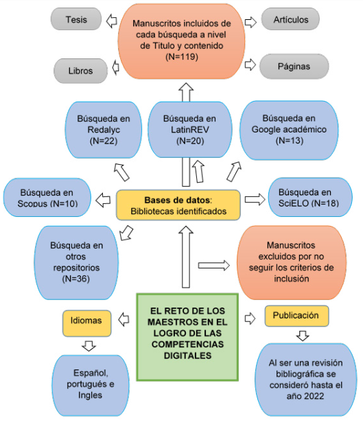 Continuando los procedimientos propios de las revisiones bibliográficas de las investigaciones documentales, la cantidad de documentos identificados y seleccionados fueron 119 manuscritos como libro, tesis, páginas web y artículos de la base de datos Scopus, Scielo, Redalyc, Google académico, LatinREV y diversos repositorios (Rocha y Hernández, 2020), estas bibliotecas son distinguidas por su reputación y confiabilidad a nivel mundial. No se contempló publicaciones de páginas web que no cuenten con fuentes garantizadas. Para la búsqueda se emplearon términos claves como enseñanza virtual, competencia maestros y educación digital, en los idiomas español, portugués e inglés. La identificación de los manuscritos sobre los retos de los maestros en el logro de las competencias digitales fue considerada por los aportes y de acuerdo a la utilidad de las investigaciones realizada en 80 días.