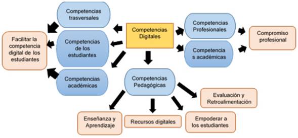 Se conoce como “competencia”, a la relación de posturas que constituyen capacidades, cualidades de personalidad y saberes, o sea son conductas ante retos que las personas predominan más que otras en un tema definido (Tobón, 2012; Real Academia Española, 2014; Rangel, 2015). En cambio, la competencia digital es multidimensional, en la cual se incluye un conjunto de actitudes y destrezas interconectadas que implican elementos informacionales, técnicos, comunicativos, mediáticos, al igual que la toma de decisiones determinantes y éticas (Gisbert y Esteve, 2011; Díaz y Loyola, 2021; Rodríguez, 2021) utilizando la computación, el acceso a Internet u demás plataformas (Carrillo et al., 2018). Con lo anterior se dirige a las responsabilidades sociales, intrapersonales y de compromiso ciudadano que logra un ser humano en el transcurso de su existencia (Gómez y Gutiérrez, 2015).