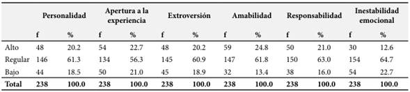 La investigación mostró que la mayoría de los estudiantes presentan una personalidad a nivel regular, destacando la apertura a la experiencia como el rasgo más alto y la estabilidad emocional como el más bajo. Esta distribución indica que, aunque algunos aspectos de la personalidad pueden favorecer el rendimiento académico, otros, como la estabilidad emocional, podrían representar áreas críticas que requieren atención para mejorar el desempeño.