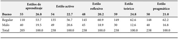 En cuanto a los estilos de aprendizaje, se observó que se encuentran predominantemente en un nivel regular. El estilo teórico se destacó como el mejor utilizado por los estudiantes, mientras que el estilo activo mostró un valor más alto en el nivel bajo. Estos resultados sugieren que los estilos de aprendizaje pueden influir en la forma en que los estudiantes enfrentan sus estudios, afectando su rendimiento académico de manera significativa.