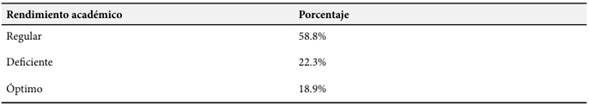Seguidamente en la Tabla 3, de acuerdo con los datos obtenidos sobre el rendimiento académico de los estudiantes, se observa que el 58.8% presentó un rendimiento académico regular. Esto indica que la mayoría de los estudiantes se encuentra en un nivel que cumple con los requisitos básicos, pero no destaca en términos de excelencia. Este grupo representa el mayor porcentaje, sugiriendo una tendencia general hacia un desempeño académico promedio. En contraste, el 22.3% de los estudiantes mostró un rendimiento académico deficiente, lo cual sugiere que una parte significativa enfrenta serias dificultades en sus estudios. Este grupo podría estar experimentando problemas en la comprensión de los contenidos, falta de preparación adecuada, o desafíos en la adaptación a los métodos de enseñanza, requiriendo atención y apoyo adicional. Por otro lado, solo el 18.9% de los estudiantes logró un rendimiento académico óptimo. Este porcentaje es menor en comparación con los otros dos grupos, indicando que una proporción relativamente pequeña de estudiantes se destaca significativamente con calificaciones altas.
