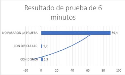 Para la prueba de 6 minutos se determinó que del total de la muestra el 10.6% de los pacientes pasaron la prueba mientras que la diferencia no lo lograron (89.4%). Cabe recalcar que aquellos que logran pasar la prueba siempre lo hacen con dificultades para lo cual del 10.6% que si la pasaron el 8.65% de ellos terminaron la prueba con dificultad mientras que el 2% pasaron la prueba bajo la condición de disnea (Gráfico 2).